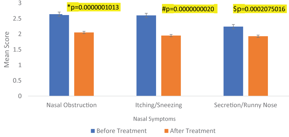 Total Nasal Symptom Scores (TNSS): A statistically significant reduction in nasal obstruction (p - value = 0.0000001013), itching/sneezing (p - value = 0.0000000020), and Secretion/runny nose mean scores (p - value = 0.0002075016) was observed on Day 1 (24-hour), Day 3 and Day 7 following treatment with Levocetirizine (Table 2, Figure 1).