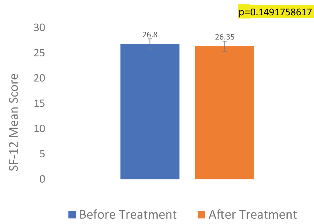 The mean SF-12 scores indication of 26.80 (±2.63), before treatment with Levocetirizine, suggests a reduced physical and mental health functioning as an indicator of the quality of life in patients with allergic rhinitis. Following treatment with Levocetirizine, a non-significant (p - value = 0.1491758617) change in SF-12 scores from 26.80 (±2.63) to 25.55 (±1.82) was observed among patients with allergic rhinitis. Thus, Levocetirizine did not impair the physical and mental health functioning of allergic rhinitis. Patients (Figure 2).