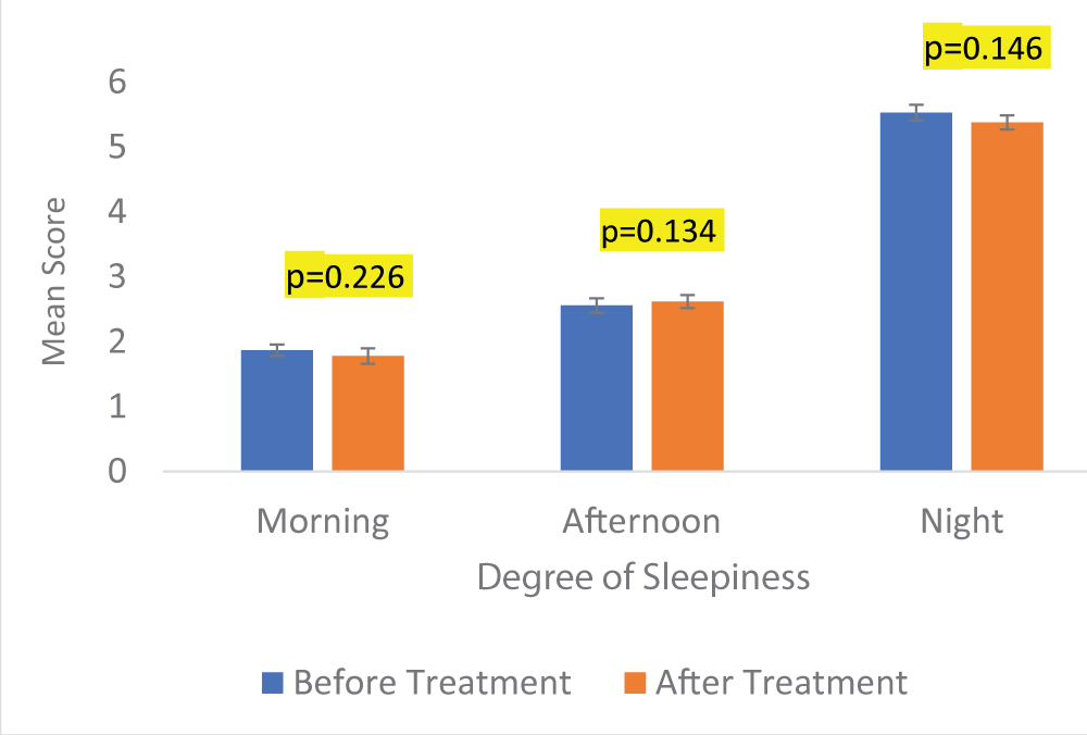 The change in mean scores of sleepiness at morning, afternoon, and night time points was found to be 5.11%, 2.29%, and 2.82% following treatment with Levocetirizine. No significant change in the corresponding p - values for the degree of sleepiness at a different time of the day was observed (p - value = 0.226 [morning], 0.134 [afternoon], and 0.146 [night]) (Figure 3).