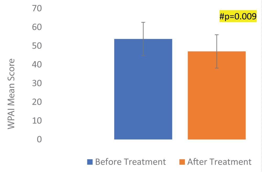 Figure 4: Effect of Levocetirizine on Work Productivity and Activity Impairment in Patients with Allergic Rhinitis. WPAI: Work Productivity and Activity Impairment. #p < 0.05 vs. Before Treatment score.