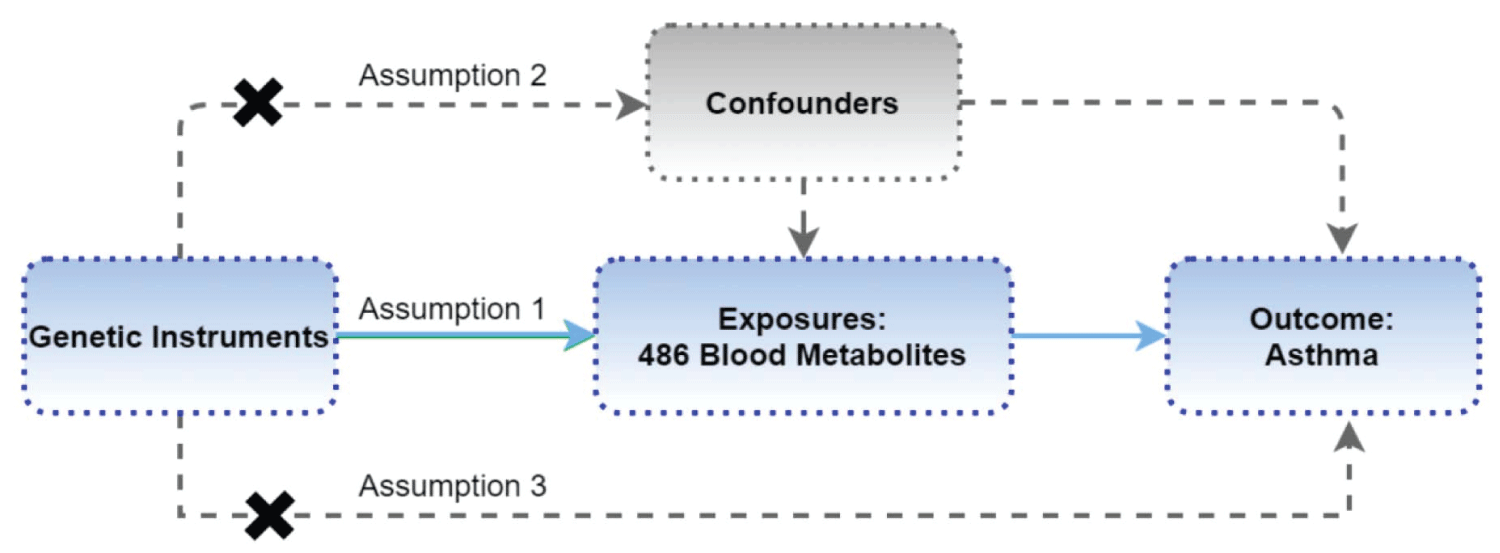 Mendelian Randomization (MR) is a statistical method that leverages genetic variants as instrumental variables to establish causal relationships between an exposure and an outcome in observational studies [8]. This method mimics randomized controlled trials by utilizing genetic variations as proxies for exposures, overcoming confounding and reverse causation typical in traditional observational studies [9]. The advantage lies in the natural randomization of exposure, akin to a randomized controlled trial [10], but without ethical complexities [11]. Additionally, MR can distinguish causation from correlation by assessing whether genetic variants impacting exposure also affect outcomes, shedding light on potential causal relationships [12]. MR’s value is evident in investigating hard-to-manipulate exposures, like risk factors such as smoking or alcohol consumption [13], to evaluate their impact on health outcomes [14]. Applying MR to study serum metabolites and asthma can distinguish whether specific metabolic pathways cause the disease or result from it [11]. This approach offers the potential to uncover intervention targets and strategies for asthma relief.