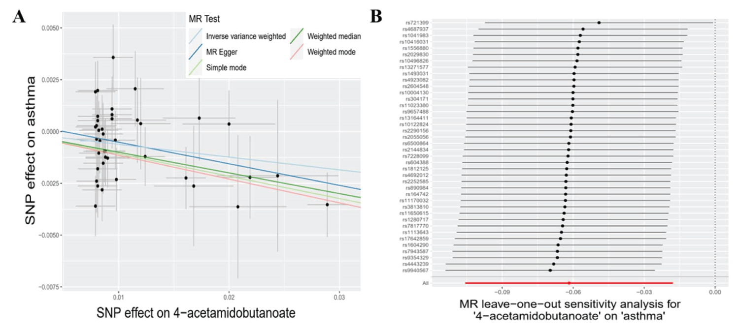 Figure 2: The causal relationships between 4-acetamidobutanoate and asthma, along with sensitivity analyses. A: Scatter plots of the 5 MR models for 4-acetamidobutanoate with the risk of asthma. light blue line: inverse variance weighted; blue line: MR Egger; light green line: simple model-based estimator; green line: weighted median estimator; red line: weighted model-based estimator. B: Forest plots show the results of leave-one-out analyses of 4-acetamidobutanoate.