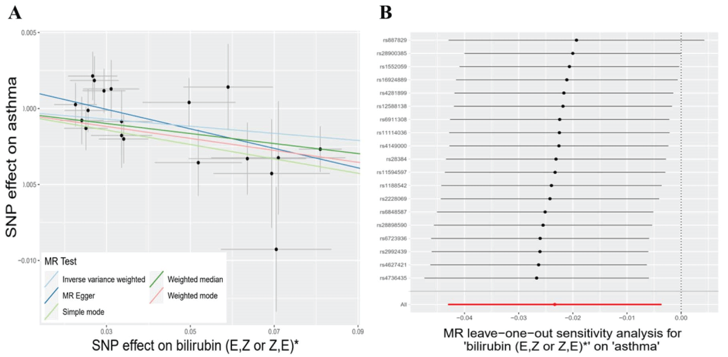 Figure 4: The causal relationships between bilirubin (E, Z or Z, E) and asthma, and their subsequent sensitivity analyses. A: The risk of asthma is depicted in scatter plots across 5 MR models for bilirubin (E, Z or Z, E). The associations are represented by different lines: light blue for inverse variance weighted, blue for MR Egger, light green for the simple model-based estimator, green for the weighted median estimator, and red for the weighted model-based estimator. B: Leave-one-out analyses of bilirubin (E, Z or Z, E) are displayed in forest plots, providing insights into the results.