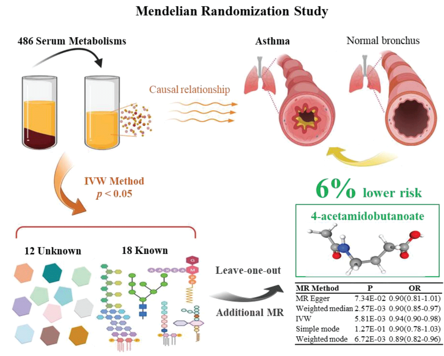 Results: We identified 18 known and 12 unknown metabolites with potential associations with asthma risk. Among known metabolites, seven exhibited protective effects (e.g., 4-acetamidobutanoate, allantoin, kynurenine, oxidized bilirubin*), while eleven were considered risk factors (e.g., ornithine, N-acetylornithine, alanine). Through the integration of four additional MR models and sensitivity analyses, we revealed a connection between 4-acetamidobutanoate and approximately 6% lower asthma risk (OR = 0.94, 95% CI: 0.90–0.98).