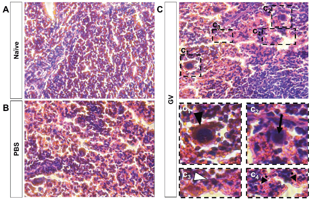 Figure 1: Histological changes are observed in the spleen tissue of GV-injected mice. Microscopic observations and histological evaluation of spleen tissue from (A) naïve, (B) PBS-, and (C) GV-injected mice. While (A) naïve and (B) PBS-injected mice don’t show major spleen histological changes, (C) GV-injected mice show megakaryocytes (C1), enlarged lymphoid follicles (C2), polynuclear inflammatory infiltration (C3), and extension in red-pulps (C4) in spleen tissue.