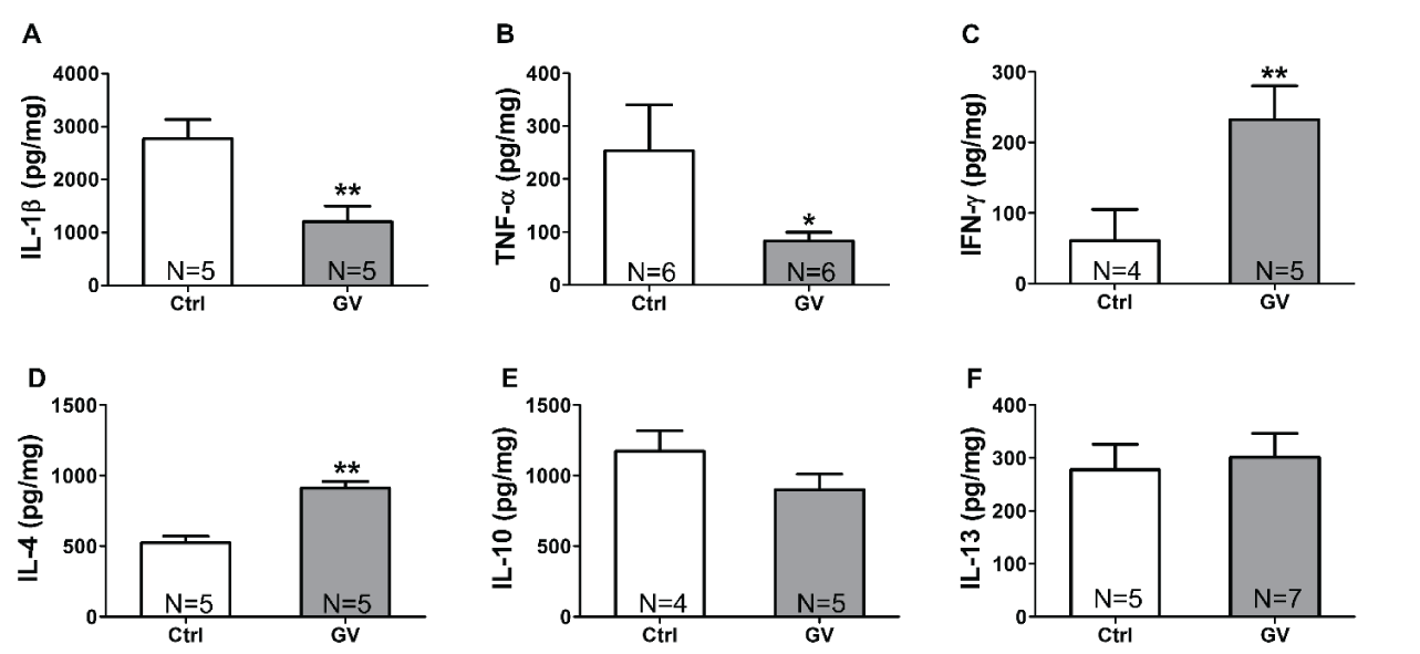 Results: Our data show that GV-treated mice have decreased levels of proinflammatory cytokines (IL-1β and TNF-α) and increased levels of anti-inflammatory cytokines (IL-4) in their spleens. In addition, IFN-γ which can modulate pro-inflammatory cytokine production was upregulated in GV-treated mice.